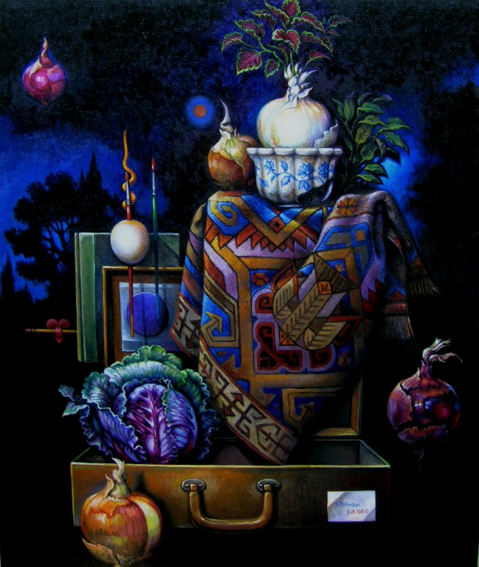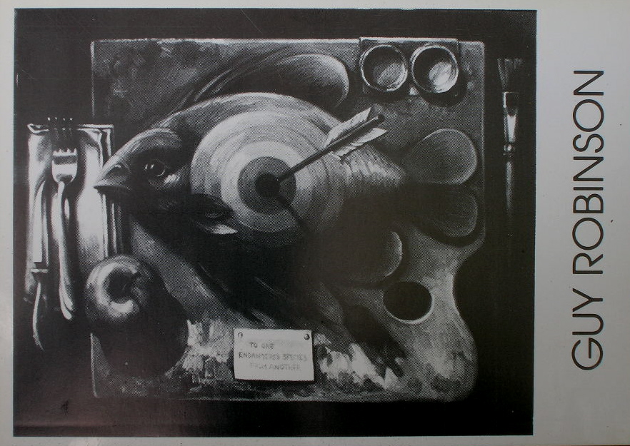 | Guy Robinson - H.L. Stine Fine Arts Atlanta Ga. Dan Liss - Art Papers Dec. 1989 What we see in art is often what we are looking for, or at least what we are open to seeing. Guy Robinson, in his painting and sculpture, offers us a number of ways to interact with his work. At first glance, it is easy to look at the classical forms and the craftsmanship in these works; occasional titles from classical Greek mythology gives these forms a resonance that we might feel, for instance, in viewing gargoyles on an old cathedral. Most of Robinson's faces have a finely honed ambiguity, in the curve of a lip, the tilt of the head, the openness of the eyes. We bring our own feelings to the work: if we are feeling joy, we will see a reflection of it here; and if we are feeling pain, we will find a reflection of that here as well. If we expect art to raise questions and stimulate discussion, the imagery and symbols in Robinson's work are rich with these opportunities also. Many of the paintings, for example, include tools of he painter and sculptor.Clearly the process intrigues Robinson as much as the end result. Not all these pieces, though are dead serious stuff. Some pieces are marvelously playful, such as the "Rebellious Still Life" , in which all the vegetables are assuming the classic pose, but they are the wrong colors. In "Which Came First?" a bird gives an egg much larger than itself a quizzical eye. Like many other artists, Robinson sometimes uses titles to raise more questions than he answers. A stunning portrait labeled "Initiation #2" is a case in point. The image of a nude woman standing with a dog,looking off to the side is captivating simply as a striking, colorful image. But what does the title mean? Your guess is as good as mine, but once we have the title fixed in our minds, it forces us to consider the subject from new perspectives. "One Of A Kind" is loaded with a combination of symbols right up front. At first we see a fish with a bright colored bull's eye and an arrow piercing it. A closer examination shows the fish with a bird's face. And it appears to be set on a palette, with a paintbrush to one side. Then again, on the left side of the painting is a knife, fork and napkin, and an apple. Do we eat this fish, mount it, or what? Two of the sculptures explore in symbols the separation of male and female aspects that we often hear about from counselors and healers. The traditional male roles are explored in "Systems Of Logic #1", which has a square hole in the top of its head. "Systems Of Logic #2" wears a heart on its face, portraying the traditionally female roles of intuition and emotion. One of the paintings in the show balances these roles by joining them together. The sculpture "Woman Possessed By Her Own Shadow" becomes more haunting with each viewing. The face is divided in half, with one side very focused and attractive. The other is unfinished and disturbing. Other pieces are more ironic, like "Small Saint", in which a figure's halo looks like someone has driven spikes into his head. In one simple image, Robinson gives us the good news and the bad news about being a saint. Overall, the body of work presented in this show refers us to our own joy, pain, separation, beauty, and humor. One mythological theme, "Pygmalion", plays a part in several of the titles. Pygmalion thought he could be happy just by creating statues, but he was so successful in creating a beautiful woman in stone that he regretted that he never took the time to develop a relationship with a real woman. The statue was, of course, brought to life by the gods. With Robinson's work there is a feeling that he has both brought art to life and brought life to art, and the audience can tap in from either direction. |